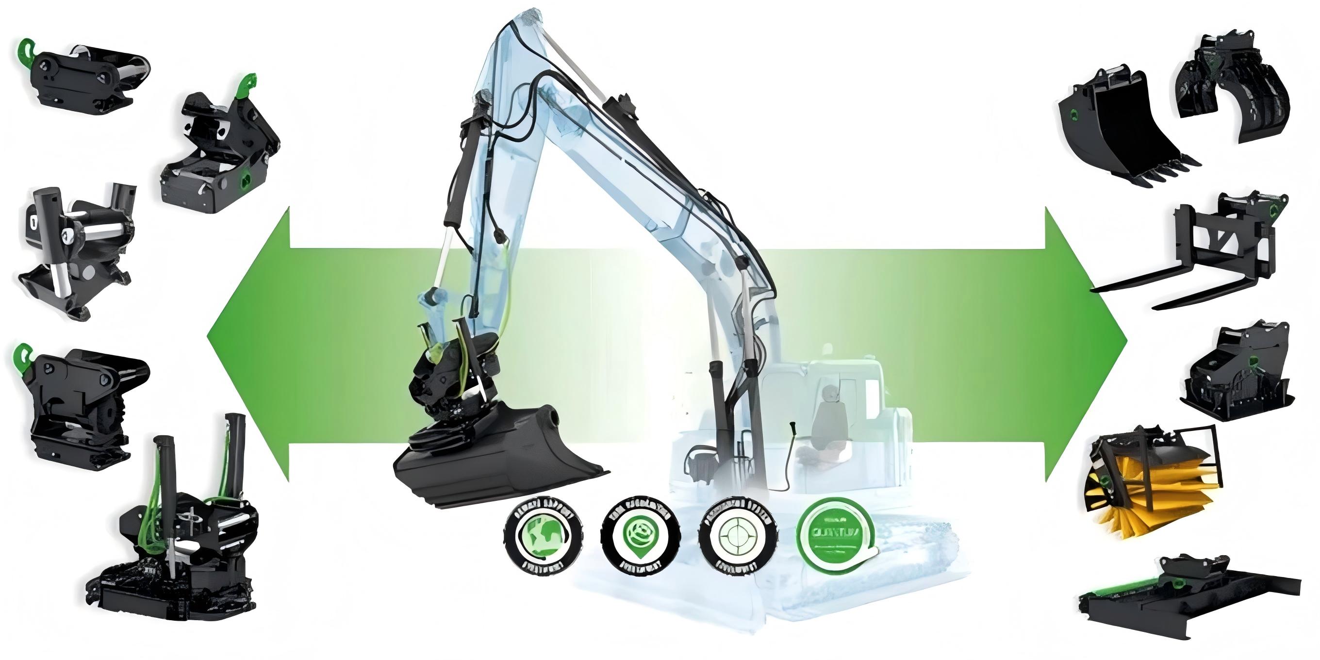 Хидрауличен интегриран модул: Ротирачкото брзо спојување развиено од Kyungwontech во Јужна Кореја вметнува механизам за менувач помеѓу горните и долните компоненти за да се постигне ротација на додатокот од 360 степени. На пример, багер за ползици опремени со ротирачка корпа може да се навалат странично на 65 степени за да ги исечат падините без потреба од повторени прилагодувања на телото.